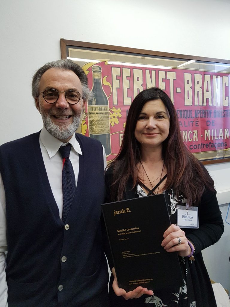 La mia tesi, infatti, ha per titolo [su_highlight background=”#9088ee” color=”#fefefe”]Mindful Leadership at Fratelli Branca Distillerie srl[/su_highlight]. È stato un onore per me farmi strumento e veicolo di diffusione, al di fuori dei confini italiani, del pensiero e della azione del Dr. Branca. La proposta di ricerca è stata approvata grazie anche al contributo del Prof. Sami Kalliomaa, mio supervisore.